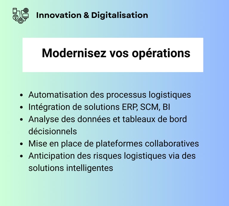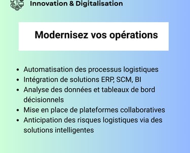 Chez InfretTech Consulting, nous vous aidons à automatiser vos processus, centraliser vos données et adopter des outils intelligents pour renforcer votre performance logistique.